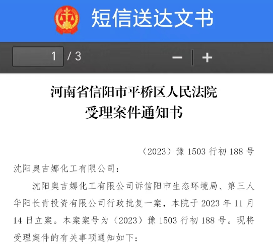 2023年11月14日, 沈陽奧吉娜化工有限公司收到《河南省信陽市平橋區(qū)人民法院受理案件通知書》【(2023)豫1503 行初188 號】。通知書顯示,被告是信陽市生態(tài)環(huán)境局,第三人是華陽長青投資有限公司。這應當是風電潤滑油央企招投標采購“民告官”第一案。