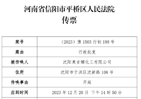 2023年12月1日,沈陽(yáng)奧吉娜化工有限公司(下簡(jiǎn)稱奧吉娜公司)收到河南省信陽(yáng)市平橋區(qū)人民法院開庭傳票,奧吉娜公司訴信陽(yáng)市生態(tài)環(huán)境局和第三人華陽(yáng)長(zhǎng)青投資有限公司行政訴訟案,將于2023年12月20日14時(shí)50分開庭審理。屆時(shí),這起風(fēng)電潤(rùn)滑油央企招投標(biāo)“民告官”第一案結(jié)果如何,讓我們拭目以待,敬請(qǐng)關(guān)注!
