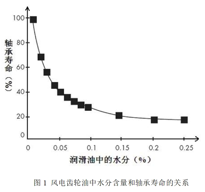 潤(rùn)滑油中的水分是導(dǎo)致風(fēng)電機(jī)組失效的一個(gè)主要因素。通過(guò)SKF科研人員發(fā)現(xiàn),風(fēng)電齒輪油中的水分含量達(dá)到1000ppm時(shí),軸承的壽命會(huì)降低70%(如圖1所示)。另外,據(jù)美國(guó)再生能源實(shí)驗(yàn)室研究發(fā)現(xiàn),齒輪箱的失效開(kāi)始于軸承,一旦軸承開(kāi)始失效,其他的齒輪等部件也會(huì)出現(xiàn)相應(yīng)的問(wèn)題。所以為了使風(fēng)電齒輪箱達(dá)到20年的壽命,必須嚴(yán)格控制風(fēng)電齒輪油中的水分。據(jù)美國(guó)齒輪箱制造協(xié)會(huì)的標(biāo)準(zhǔn)的規(guī)定,風(fēng)電齒輪油中的水分要控制在500ppm以下,但是為了提高軸承的壽命,我們應(yīng)該將水分控制在150ppm以下,這樣軸承壽命會(huì)提高到原來(lái)的2到3倍。
