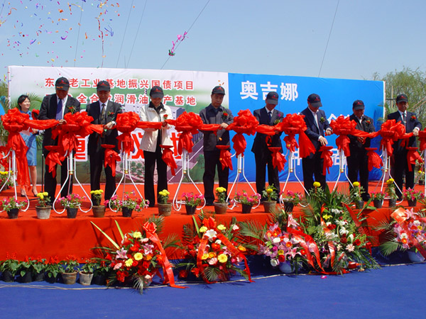 2006年 5 月 11 日上午9:59分,由沈陽奧吉娜化工有限公司承建的我國第一個 PAO 全合成潤滑油生產(chǎn)基地奠基儀式正式開始,國家發(fā)改委有關(guān)項目負責人,遼寧省政協(xié),科協(xié)、沈陽市政府有關(guān)領(lǐng)導、金杯汽車股份公司、沈陽航天三菱發(fā)動機有限公司,航天新光發(fā)動機有限公司代表、曾與奧吉娜公司建立 “校企科研合作平臺”的大連理工大學代表及軍方代表、業(yè)界人士共同到場出席剪彩儀式。